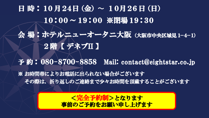 8月に開催致しました大阪市出張測定会は、大変多くのお客様にご来場頂き、おかげさまで盛況のうちに終了致しました。会場では多数のご好評とともに、「もう一度参加したい」「次回も案内してほしい」といったお声を多く頂戴致しました。そうした温かいご要望にお応えし、短期間ではございますが、約2ヶ月ぶりに大阪市にて出張測定会を開催致します。前回ご来場頂けなかったお客様や、ご予約を承ることが出来なかったお客様は、是非、この機会にご来場頂けますと幸いです。